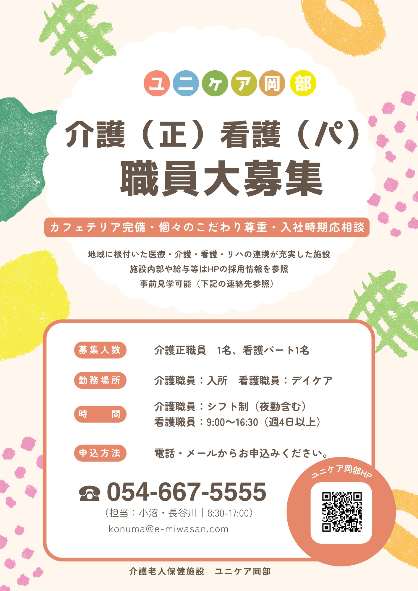 - 2026年02月22日 採用情報 【ユニケア岡部】介護職員(正職)、看護職員(パート)各1名募集中!